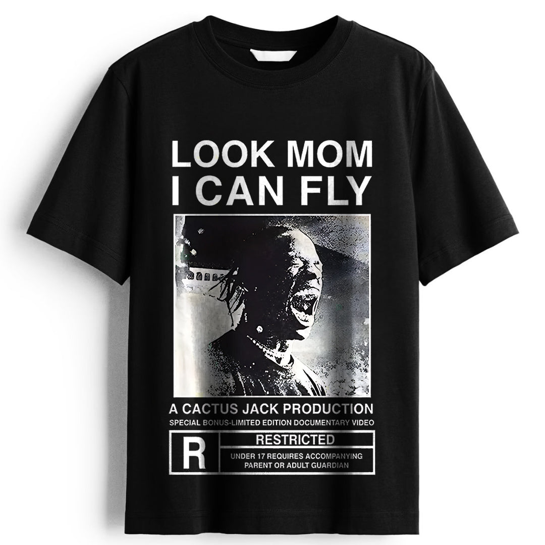 Inspired by the legendary Travis Scott documentary Look Mom, I Can Fly, this graphic tee embodies the raw energy and rebellious spirit of Cactus Jack. Featuring a distressed, high-contrast image of Travis with bold typography and an R-rated vintage movie poster aesthetic, this design is perfect for fans of hip-hop, streetwear, and edgy fashion. Whether you're rocking it at concerts, casual outings, or just embracing the hype culture, this tee is a must-have statement piece!