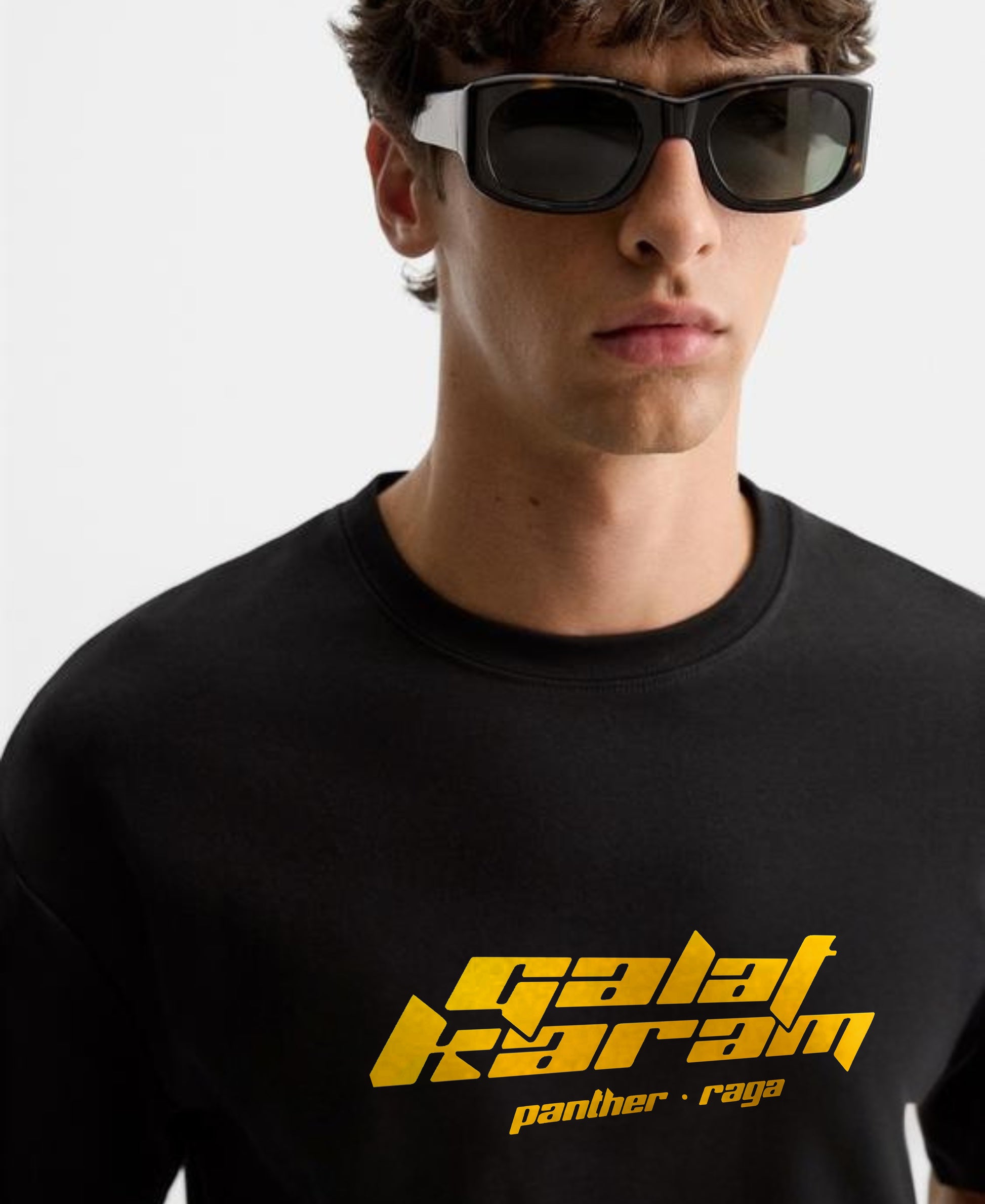 Front: Futuristic golden-yellow typography with the text “Galat Karam – Panther Raga”, giving a powerful streetwear vibe.